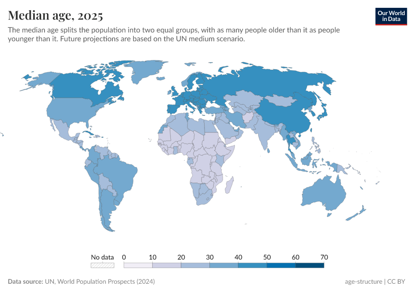 Lower-income countries tend to have a lower median age. This is because they have a younger and faster growing population overall.