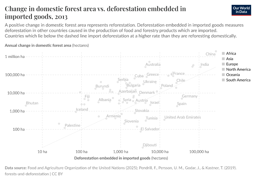 In the chart we see the comparison between the change in domestic forest area, and deforestation driven by imported goods.5 On the vertical axis we have the domestic change in forest area: this is shown only for countries where the forest area is increasing. Since there is often year-to-year variability in deforestation or reforestation rates, this is shown as the five-year average. On the x-axis we have imported deforestation. The grey line marks where the area of domestic regrowth of forests is exactly equal to imported deforestation. Countries that lie along this line would have a net-neutral impact on global forests: the area they are causing to deforestation overseas is exactly as large as the area they are regrowing at home.