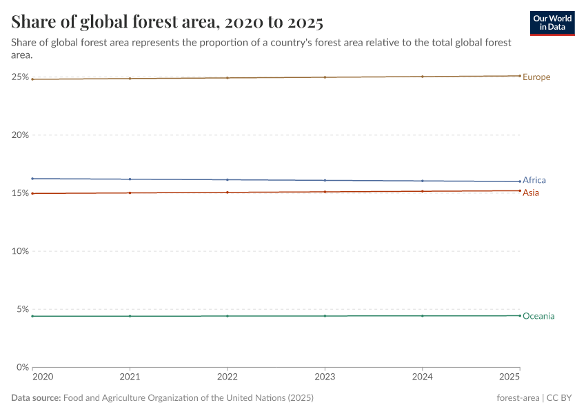 We see that Europe – dominated by forests across Russia – holds the greatest share of global forests. They are home to one-quarter of the world’s forest area.