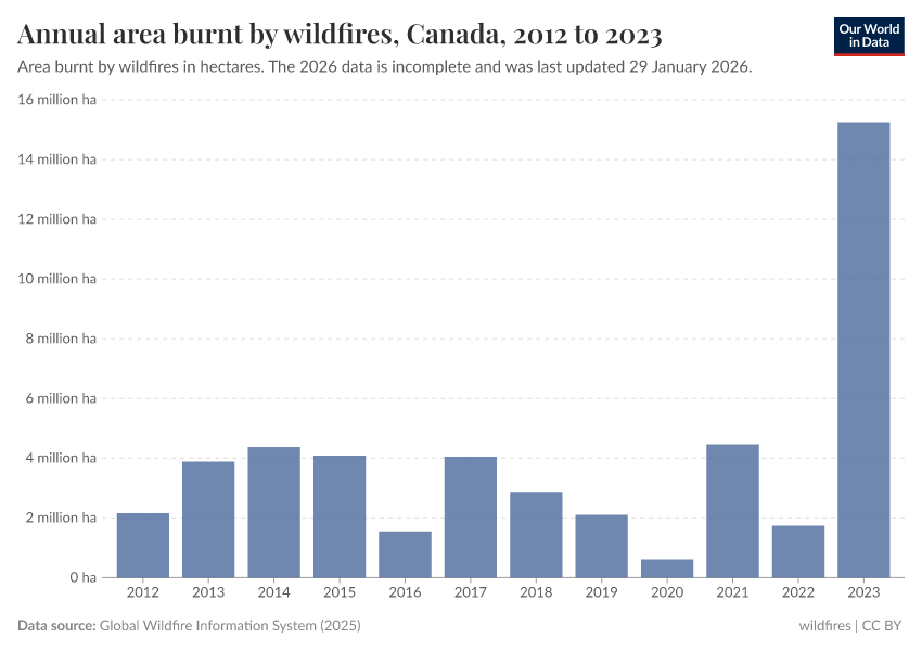 “Data Page: Annual area burnt by wildfires”, part of the following publication: Hannah Ritchie, Pablo Rosado, and Veronika Samborska (2024) - “Climate Change”. Data adapted from Global Wildfire Information System. Retrieved from https://data-world-bank-pip.owid.pages.dev/grapher/annual-area-burnt-by-wildfires [online resource]How to cite this data