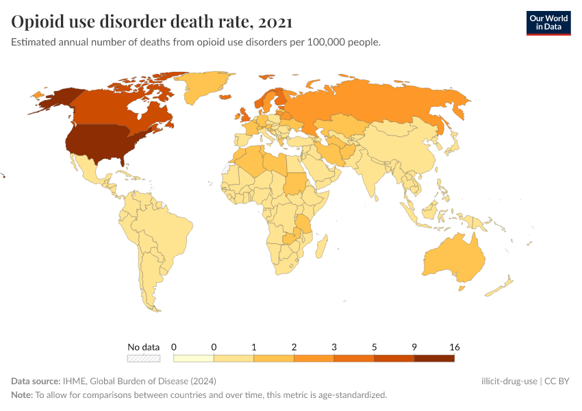 “Data Page: Opioid use disorder death rate”, part of the following publication: Esteban Ortiz-Ospina and Max Roser (2016) - “Global Health”. Data adapted from IHME, Global Burden of Disease. Retrieved from https://data-world-bank-pip.owid.pages.dev/grapher/death-rate-from-opioid-use [online resource]How to cite this data