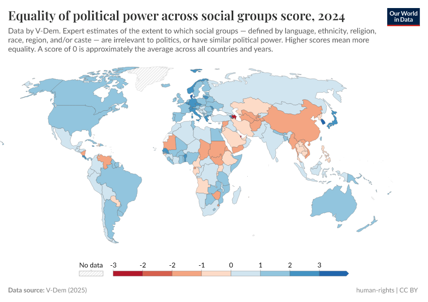V-Dem (2025) – processed by Our World in Data. “Equality of political power across social groups – (central estimate)” [dataset]. V-Dem, “Democracy report v15” [original data]. Retrieved May 29, 2025 from https://data-world-bank-pip.owid.pages.dev/grapher/equality-of-political-power-across-social-groups-score