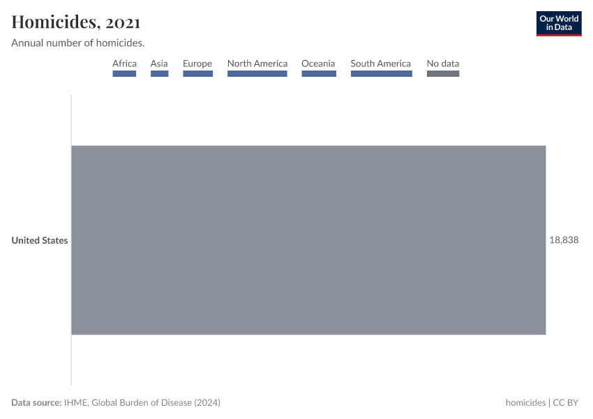 IHME, Global Burden of Disease (2024) – with minor processing by Our World in Data. “Homicides” [dataset]. IHME, Global Burden of Disease, “Global Burden of Disease - Deaths and DALYs” [original data]. Retrieved May 29, 2025 from https://data-world-bank-pip.owid.pages.dev/grapher/homicides-ihme