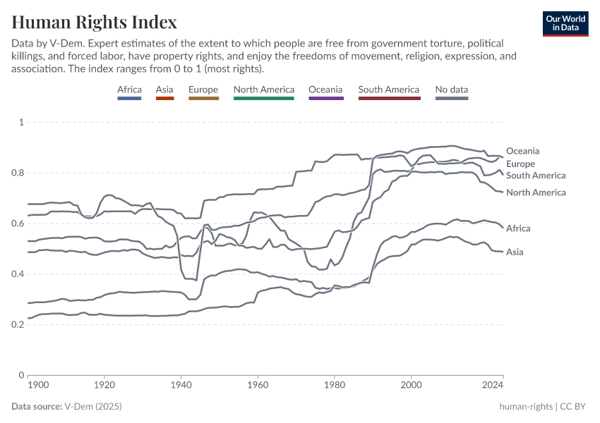 V-Dem (2025) – processed by Our World in Data. “Human rights index – (central estimate)” [dataset]. V-Dem, “Democracy report v15” [original data]. Retrieved May 29, 2025 from https://data-world-bank-pip.owid.pages.dev/grapher/human-rights-index-vdem