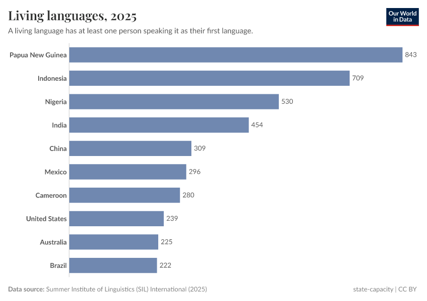 “Data Page: Living languages”, part of the following publication: Bastian Herre and Pablo Arriagada (2023) - “State Capacity”. Data adapted from Summer Institute of Linguistics (SIL) International. Retrieved from https://data-world-bank-pip.owid.pages.dev/grapher/living-languages [online resource]How to cite this data