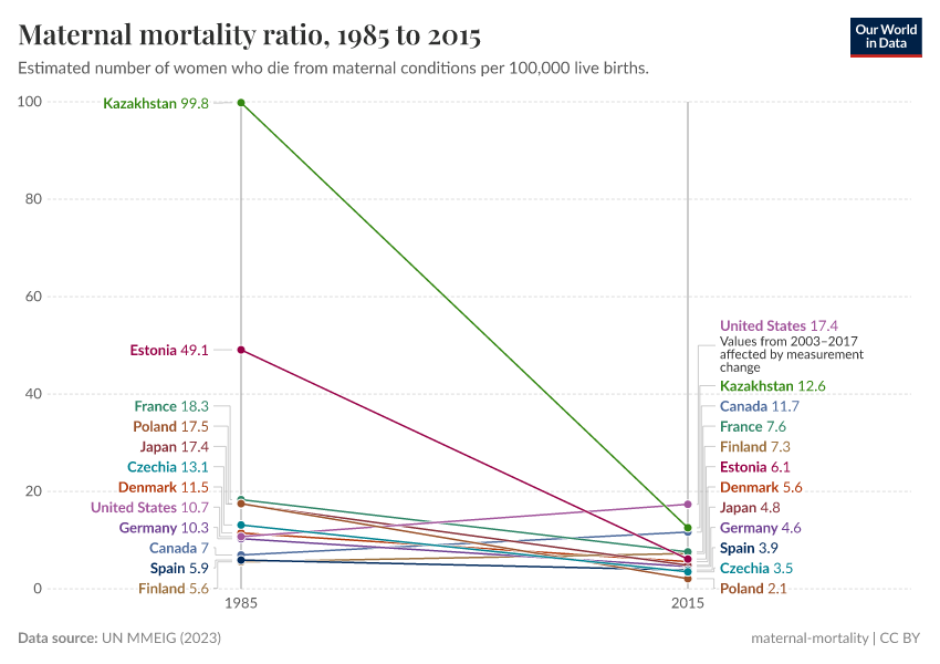 UN MMEIG (2023) – processed by Our World in Data. “Maternal mortality ratio” [dataset]. UN MMEIG (WHO, UNICEF, UNFPA, World Bank Group and UNDESA/ Population Division), “Trends in maternal mortality 2020” [original data]. Retrieved May 29, 2025 from https://data-world-bank-pip.owid.pages.dev/grapher/maternal-mortality-slope-chart