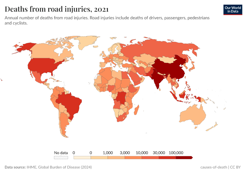 IHME, Global Burden of Disease (2024) – with minor processing by Our World in Data. “Deaths from road injuries” [dataset]. IHME, Global Burden of Disease, “Global Burden of Disease - Deaths and DALYs” [original data]. Retrieved May 29, 2025 from https://data-world-bank-pip.owid.pages.dev/grapher/number-of-deaths-from-road-injuries