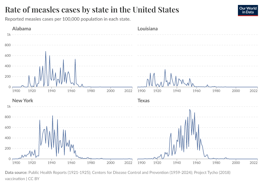Public Health Reports (1921-1925); Centers for Disease Control and Prevention (1959-2024); Project Tycho (2018) – with major processing by Our World in Data. “Rate of measles cases by state in the United States” [dataset]. Project Tycho, “Project Tycho - Measles cases”; Centers for Disease Prevention and Control, “CDC Summary of Notifiable Infectious Diseases - Measles”; Centers for Disease Control and Prevention, “Reported measles cases - CDC”; Centers for Disease Control and Prevention, “National Notifiable Diseases Surveillance System - Measles”; U.S. Census Bureau, “Annual Estimates of the Population for each of the States in the USA” [original data]. Retrieved May 29, 2025 from https://data-world-bank-pip.owid.pages.dev/grapher/reported-measles-case-rate-by-state-in-the-united-states