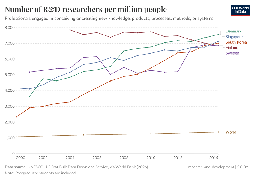 UNESCO Institute for Statistics (2025) – processed by Our World in Data. “Number of R&D researchers per million people” [dataset]. UNESCO Institute for Statistics, “World Development Indicators” [original data]. Retrieved May 29, 2025 from https://data-world-bank-pip.owid.pages.dev/grapher/researchers-in-rd-per-million-people