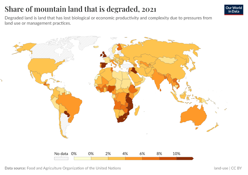 Food and Agriculture Organization of the United Nations – processed by Our World in Data. “Share of mountain land that is degraded” [dataset]. Food and Agriculture Organization of the United Nations, “Food and Agriculture Organization of the United Nations (FAO)” [original data]. Retrieved May 29, 2025 from https://data-world-bank-pip.owid.pages.dev/grapher/share-of-mountain-land-that-is-degraded