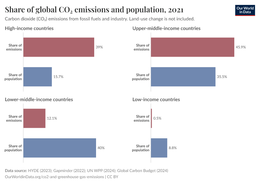 Instead, we see that high- and upper-middle income countries account for a much larger share of emissions than their population. Despite being home to just under half of the world population, they emit more than 80% of world’s CO2.
